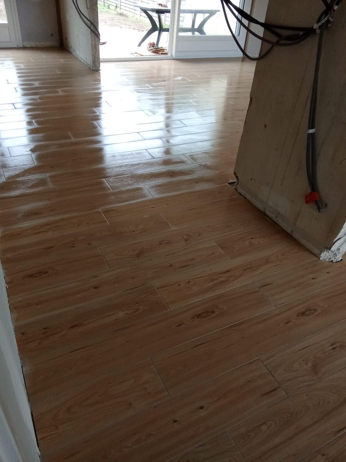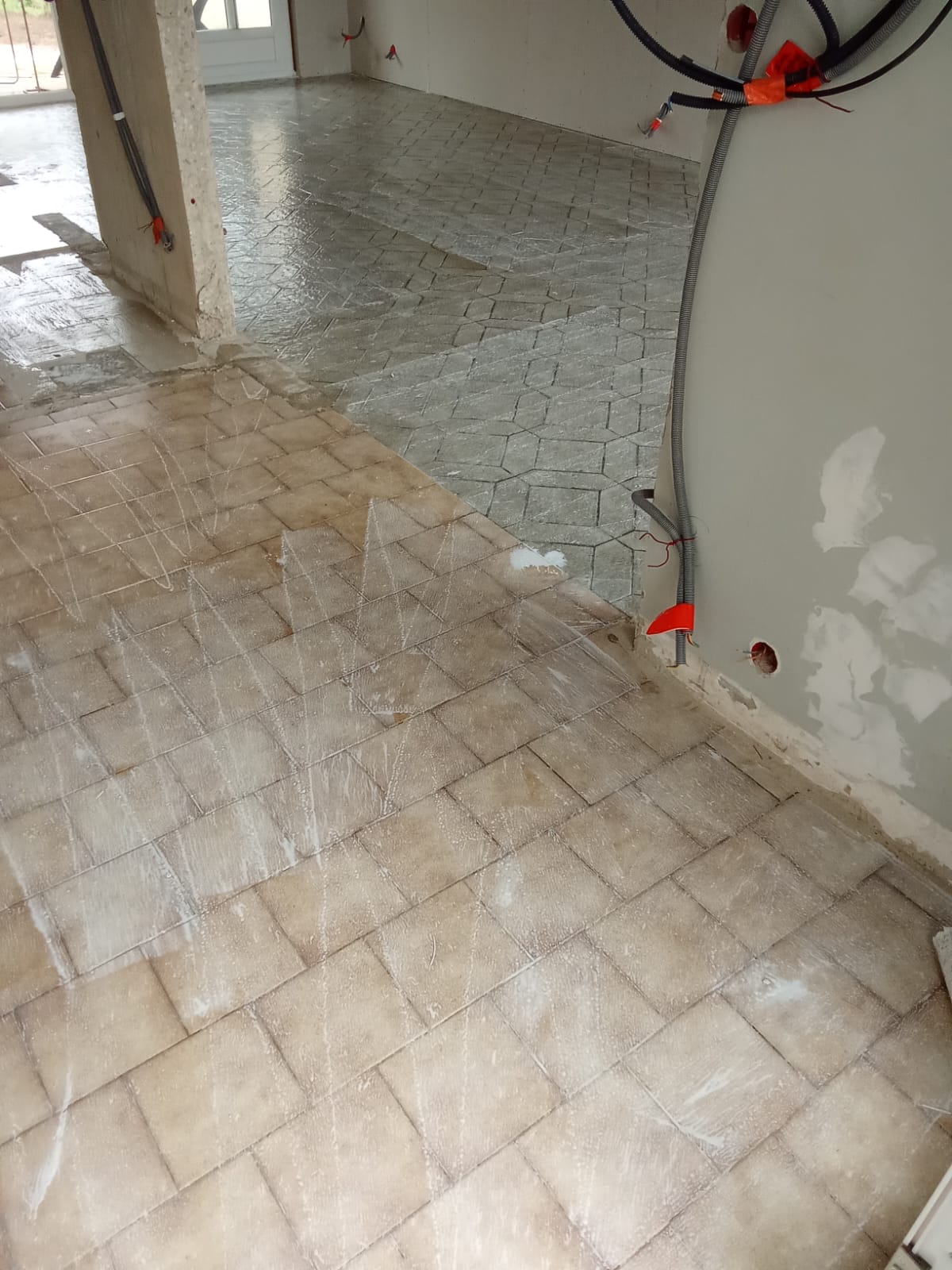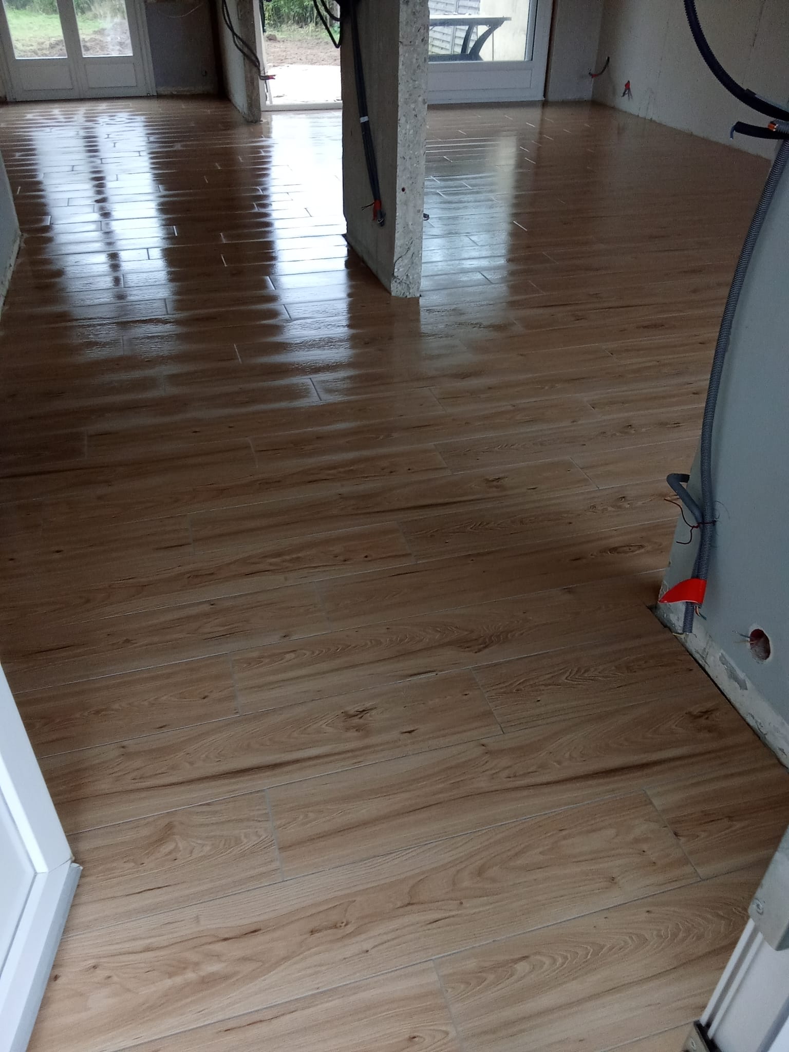 Nous avons réalisé une rénovation de sol à Saint-Barthélemy d’Anjou. Les travaux ont consisté en un ragréage soigneux avec l’application d’un primaire d’accrochage pour assurer une adhérence optimale. Ensuite, un carrelage grand format 120×120 a été posé en style parquet, offrant un rendu moderne et élégant à cette maison.