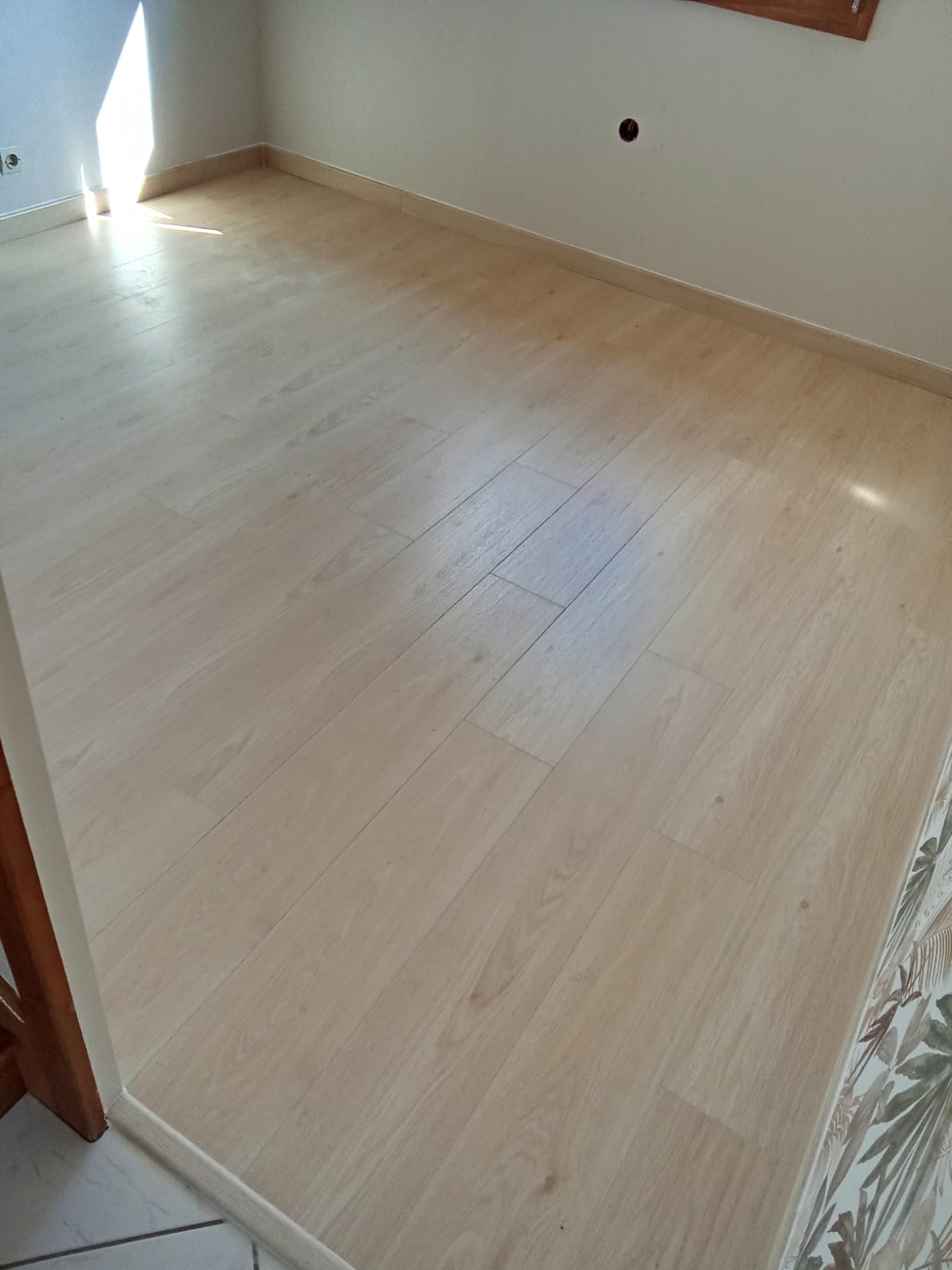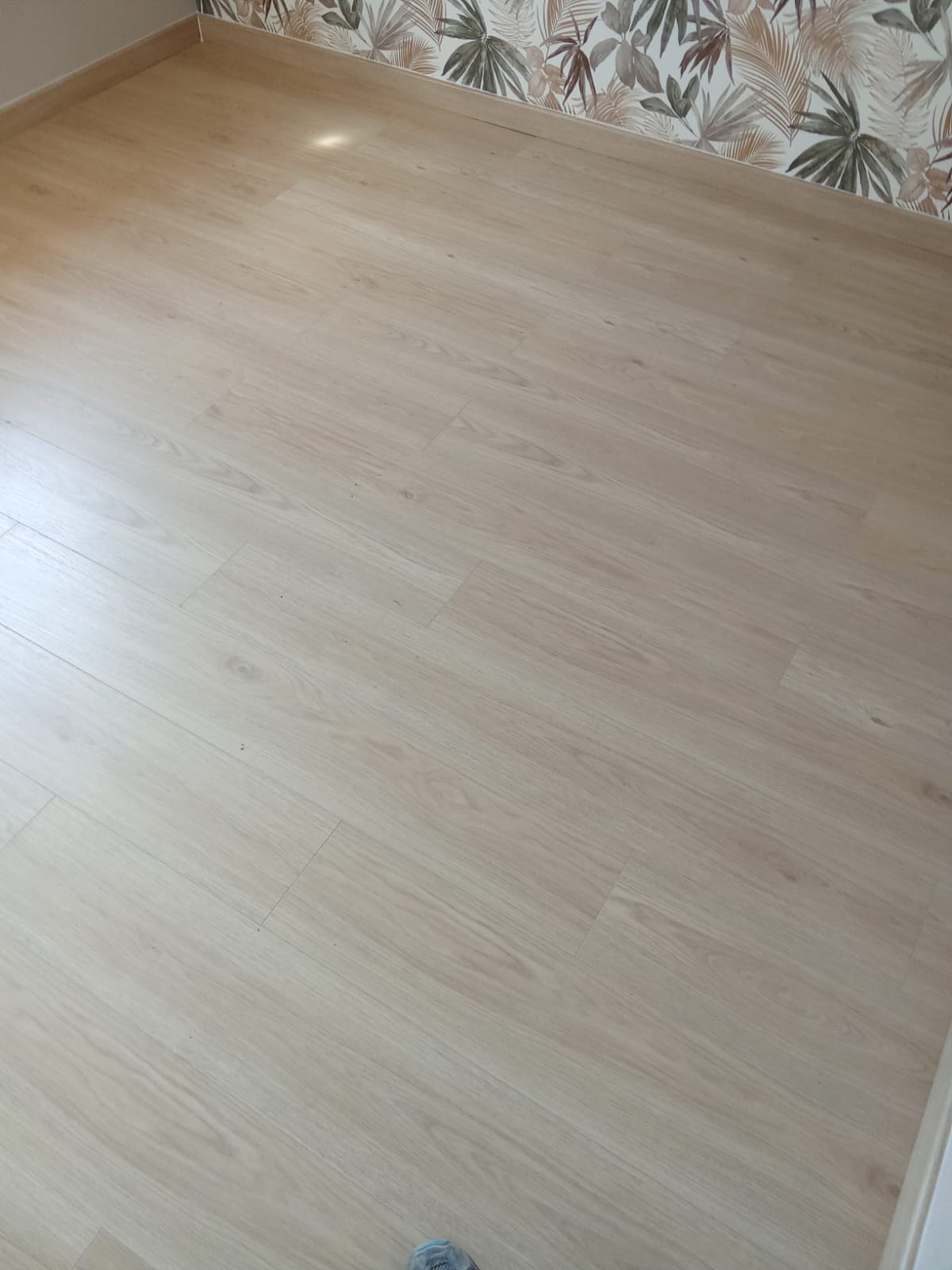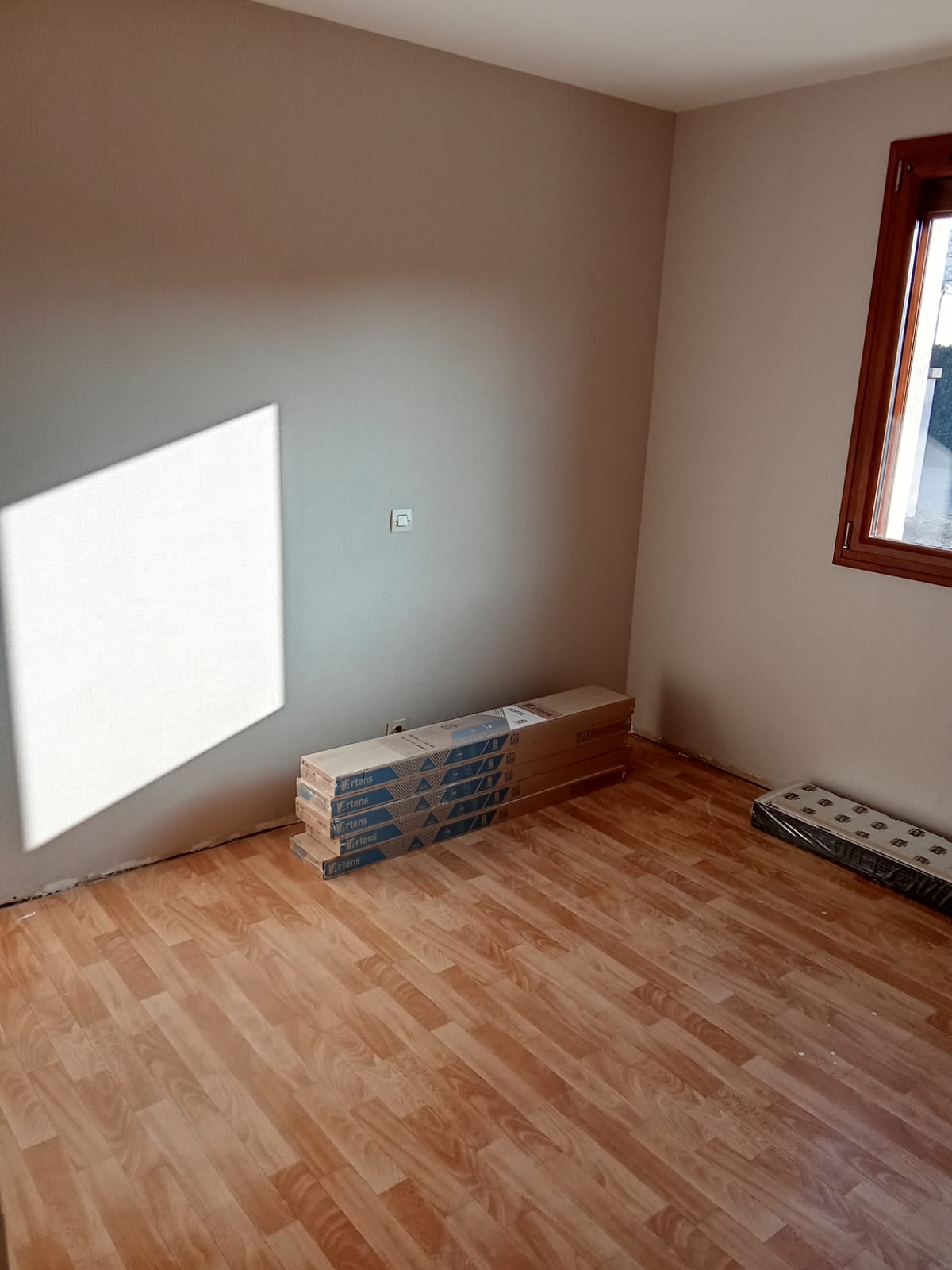 Suite à une infiltration d’eau, la chambre avait besoin d’un bon coup de frais. On a commencé par retirer l’ancienne tapisserie, puis on a repris les murs avec un enduit soigné pour assurer une surface bien lisse. Une fois les murs prêts, une tapisserie moderne a été posée avec précision. Pour finir, on a installé un parquet chaleureux accompagné de plinthes assorties, histoire de redonner à la pièce tout son confort et son charme.