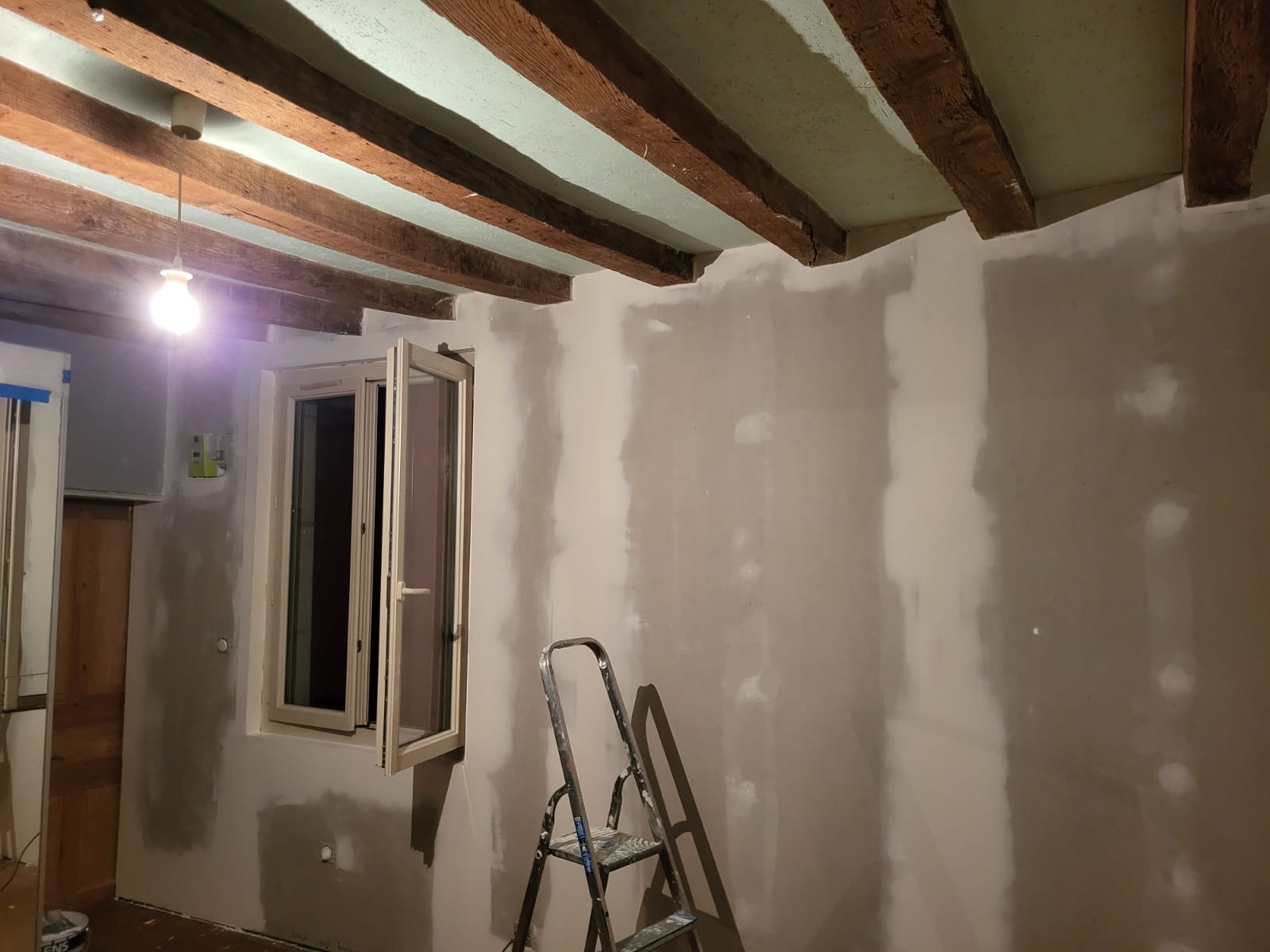 Nous avons pris en charge l’aménagement intérieur d’une chambre à La Daguenière, incluant plusieurs étapes clés pour garantir un résultat impeccable. Après avoir effectué la démolition du doublage en BA13 endommagé suite à une infiltration d’eau, nous avons posé un nouveau doublage en BA13 phonique. Nous avons soigné les finitions avec l’application de bandes et d’enduits adaptés. Pour l’esthétique, la peinture intérieure a été réalisée avec une finition complète en blanc sur le plafond et les poutres, tandis qu’une couleur bleu élégante a été choisie pour les murs, apportant une touche de modernité et de sérénité à la pièce.
