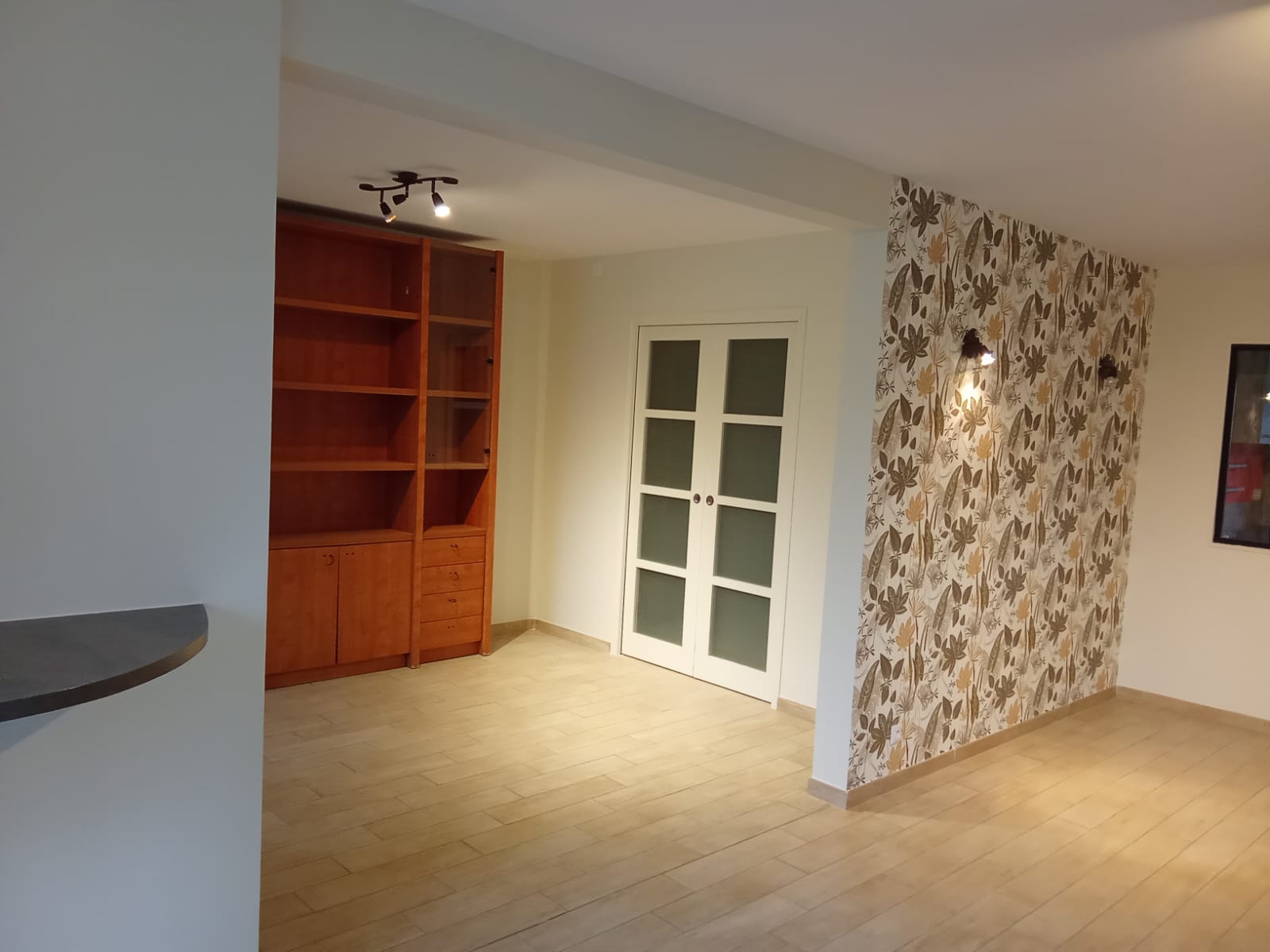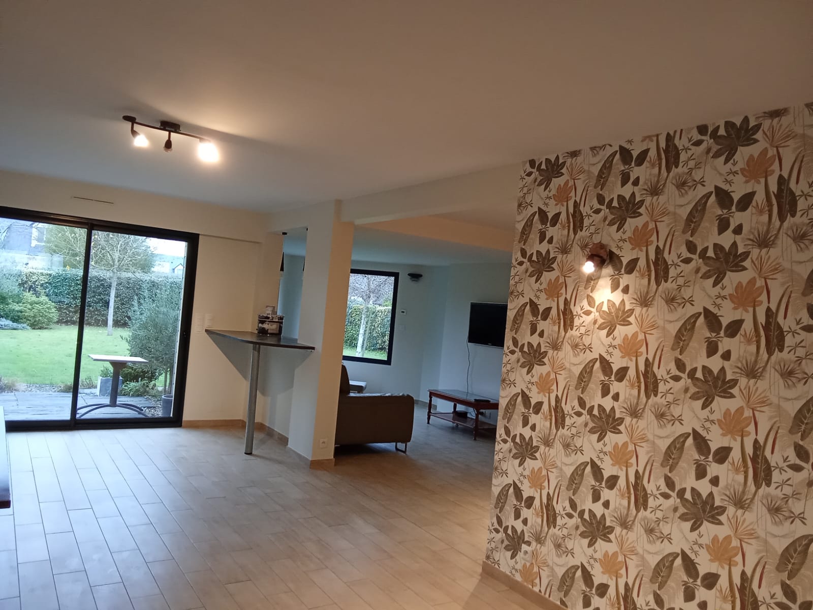 Nous avons réalisé la rénovation de la peinture intérieure d’une cuisine, d’un salon et d’un séjour à Brain-sur-l’Authion. Les travaux ont inclus l’application d’un enduit de ratissage pour une surface parfaitement lisse, suivie d’une peinture mate au plafond et d’une peinture velours blanc cassé sur les murs. Pour apporter une touche décorative et raffinée, une tapisserie à raccord a également été posée sur un mur, ajoutant du caractère et de l’élégance à l’ensemble de la pièce.
